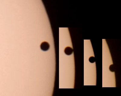measurement was much more difficult to make due to the black drop effect. This optical phenomenon appears to connect Venus' disk to the limb of the Sun (see 2nd image from left) and complicated the precise timing of the event.